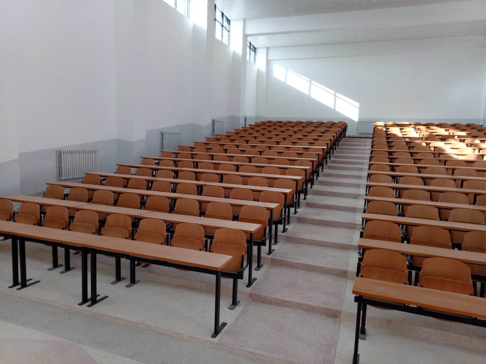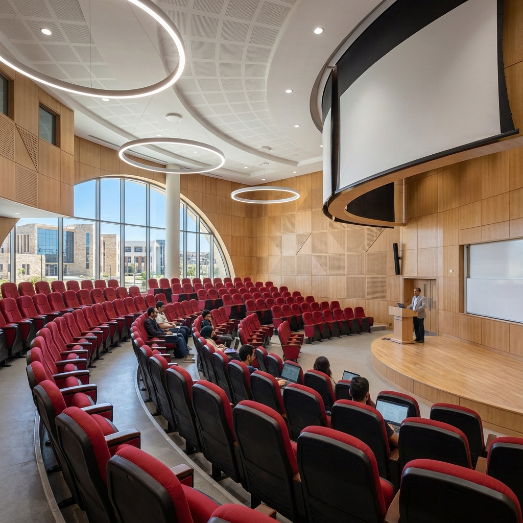 Installation de plus de 5000 places d'amphithéâtre ergonomiques avec tablettes écritoires intégrées.